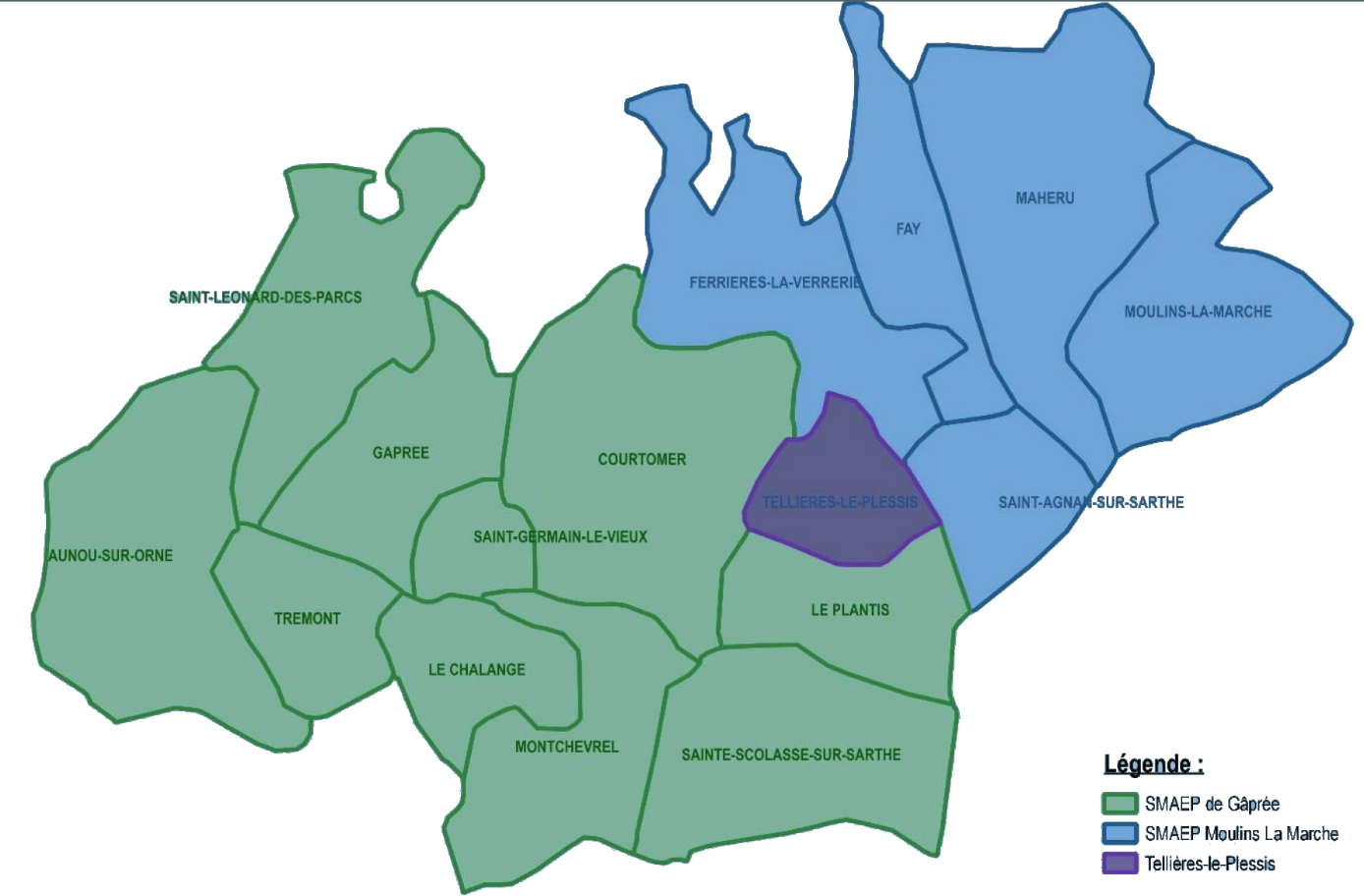 La gestion quotidienne des installations et la distribution d’eau est confiée à 2 « fermiers », la SAUR sur le périmètre de l’ex Smaep de Gâprée et Eaux de Normandie sur celui de Moulins-la-Marche. Ces fermiers ont reçu mandat de gestion à l’issue d’une procédure de délégation de service public. Celui de la SAUR prendra fin en 2031 et celui d’ Eaux de Normandie en 2028. Il appartiendra alors au syndicat de lancer une nouvelle procédure d’attribution ou de changement de mode de fonctionnement.